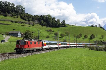 The Gotthard Panorama Express combines a scenic boat ride on Lake Lucerne with a panoramic train journey through the Swiss Alps.