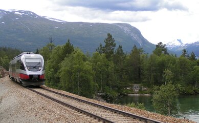 The Flåm Railway runs 20 kilometers from Myrdal station at 867 meters elevation down to the village of Flåm at sea level along the UNESCO-listed Nærøyfjord in Norway. This engineering feat features 20 tunnels, a 5-kilometer climb with a 5% gradient, and views of steep mountainsides, waterfalls, and the fjord. The one-hour journey connects to the Bergen Railway and operates year-round with electric trains.