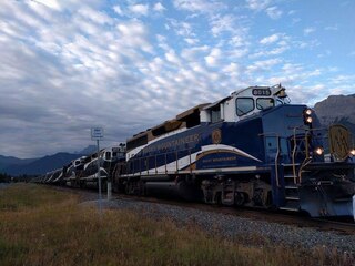 Ride the Rocky Mountaineer train through Canada's Rocky Mountains, traveling a route from Vancouver to Banff or Jasper that follows historic rail lines alongside rivers, glaciers, and peaks. The multi-day journey features dome cars for panoramic views, onboard meals with regional ingredients, and stops at mountain towns like Kamloops.