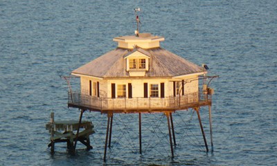Mobile Bay Middle Ground Light, built in 1885, is one of Alabama's few remaining screw-pile lighthouses.