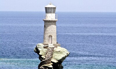 Tourlitis Lighthouse, Greece's only sea rock lighthouse, can be reached by boat from Andros.