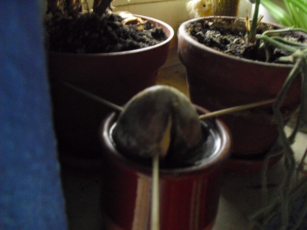 I decided to take an avocado seed and try and turn it into a tree. Chances are high it will never bear fruit but I like the way the trees look. I've had the seed halfway submerged in water for about a week now, and already I can see progress. The seed has cracked and there are fissures at the bottom. I'm hoping in the next couple of weeks to see some roots emerge.