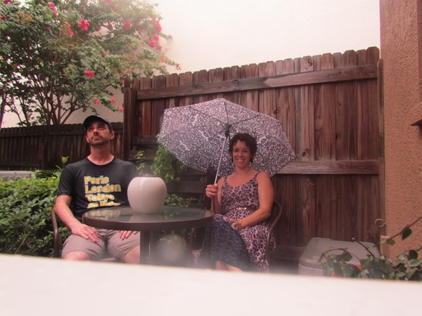 I sat outside and got soaked. She, wisely, sat outside with an umbrella.