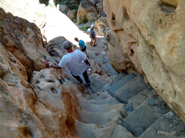 If you're brave enough, as I and three of the other "seniors" who rode the van from the Manzano Mesa Multigenerational Center to Acoma Sky City on 5/25/2016 were, you can hike down the side of the 360 foot mesa using stone steps and hand holds cut into the rock 500-900 years ago. Well done.