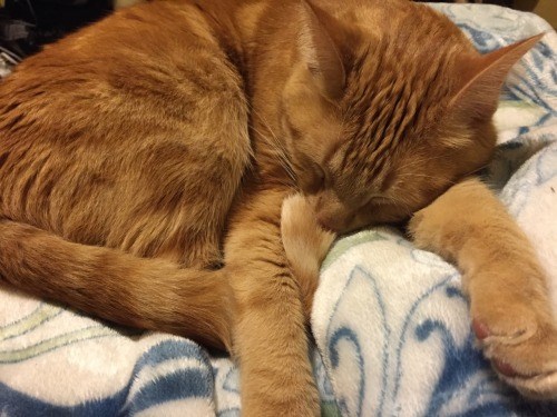 Cats-- Well, all cats in general, but of course especially mine. I've had cats all my life. This is Cal asleep with his tail in his mouth-- since I was little I wanted an orange cat just like this, and I love him so much.