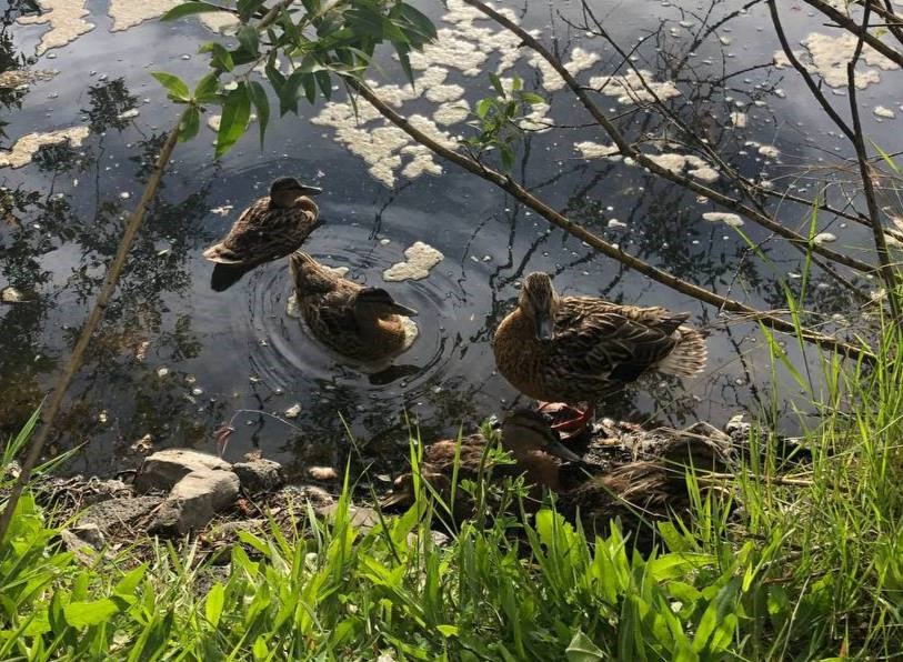 Ducks-- My home is right next to a large pond, and a flock of ducks returns there year after year. I always look forward to their return, and to seeing the ducklings arrive so cute and fluffy and tiny and grow up into the new flock.