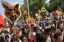 People join in a parade of "Pahela Baishakh", the first day of Bangla New Year, in Dhaka, capital of Bangladesh".